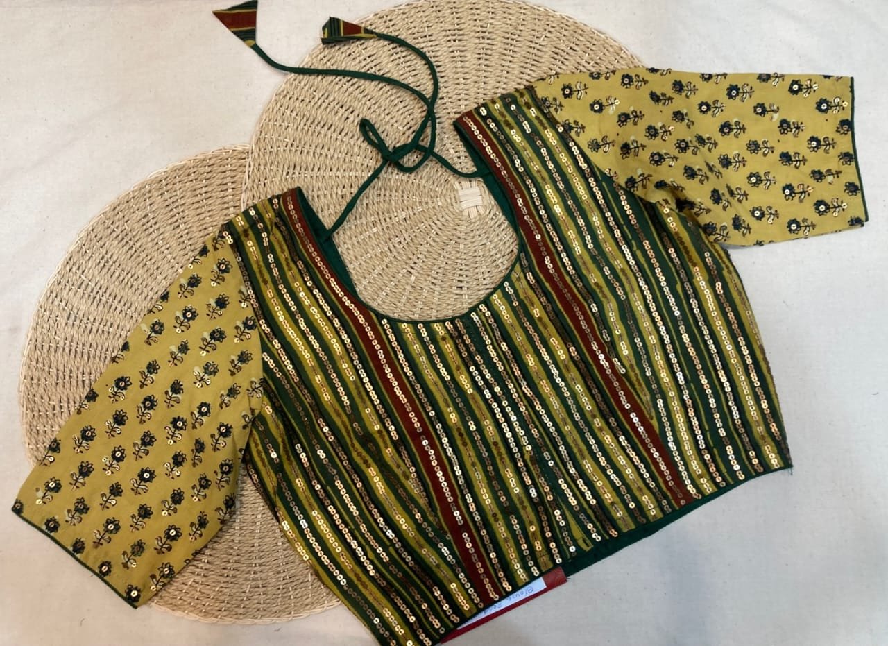 Handblock cotton ajrakh print sequence work stitched blouse to go with your every drape. The solid shades of ajrakh blouse with border detailing go perfectly with your all party wear, office wear & wedding wear sarees.