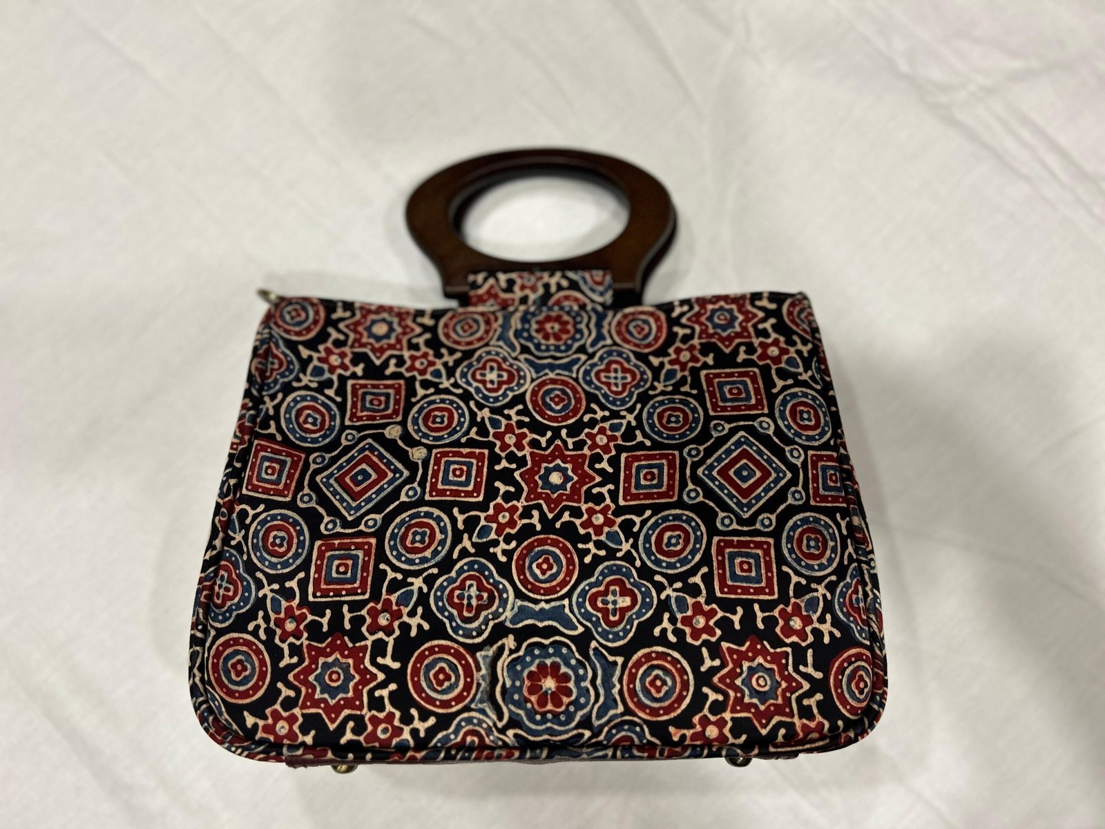 Modal silk handbag with wooden handles.
